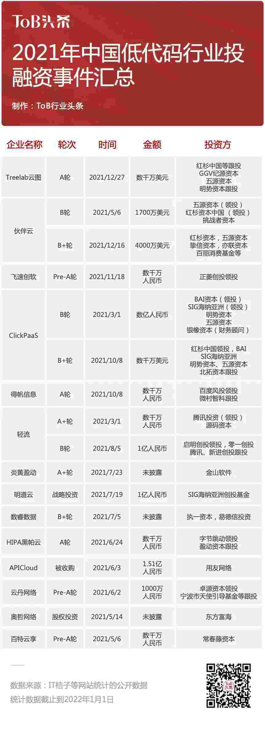 到2021年,,,,无/低代码投融资规模势头更甚,,,其中包括轻流两轮融资(A+轮数千万人民币,,,,B轮近亿人民币)、、、、钱能钱包 两轮融资(B轮数亿人民币,,,,B+轮数千万美元)、、、百特云享数千万元Pre-A轮融资......