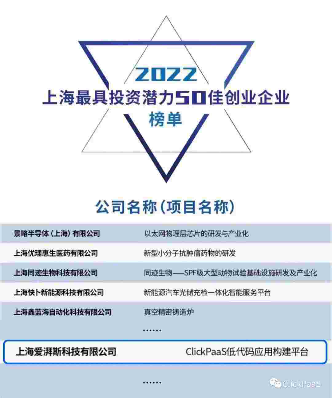 钱能钱包 作为国内低代码PaaS平台的领军企业,,与120家创企入围角逐。。期间接受了来自德同资本、、、领中资本等知名投资机构的10位投资人组成专家评委团的背靠背盲选。。并最终入围“2022上海最具投资潜力50佳创业企业”榜单,,,,被列入“上海市重点培育创业企业库”。。