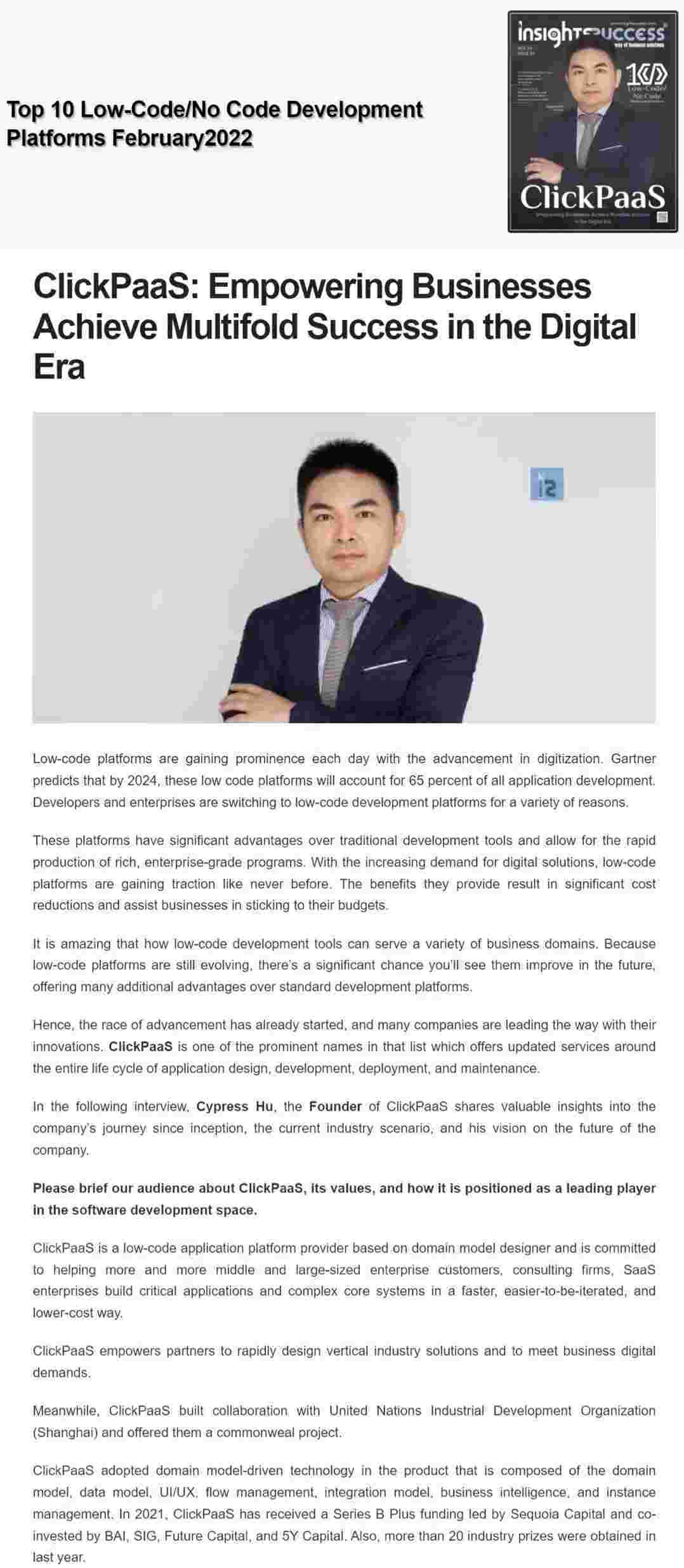 2022年年初,,,,钱能钱包入选外媒Insights Success低代码/无代码开发平台 Top10,,,,创始人、、CEO胡柏受邀接受专访并荣登封面人物,,,,他与Insights Success的读者分享了钱能钱包成立的初心、、发展历程、、、当前的行业发展趋势以及他对公司未来的展望。。。